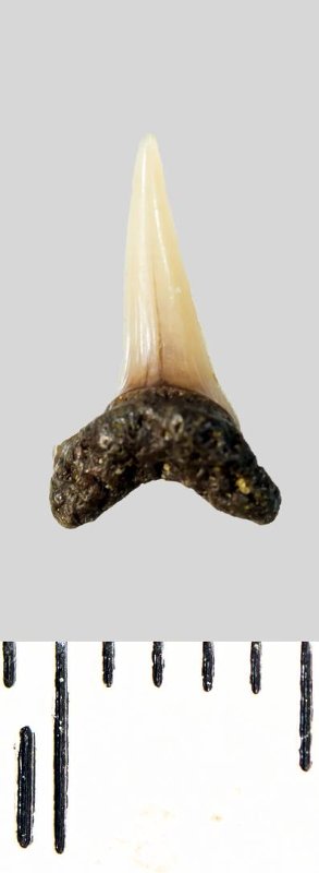Зуб. Акула. Eostriatolamia subulata (Agassiz, 1843). Классификация: Хордовые Chordata, Позвоночные Vertebrata, Хрящевые рыбы Chondrichthyes, Пластиножаберные Elasmobranchii, Акулы Selachii, Ламнообразные Lamniformes