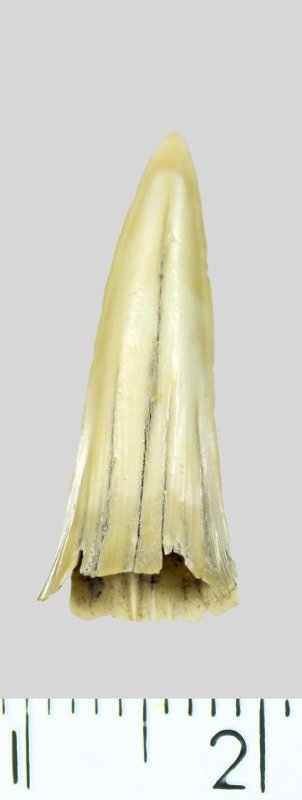 Зуб (фрагмент). Акула. Striatolamia macrota (Agassiz, 1843). Классификация: Хордовые Chordata, Позвоночные Vertebrata, Хрящевые рыбы Chondrichthyes, Пластиножаберные Elasmobranchii