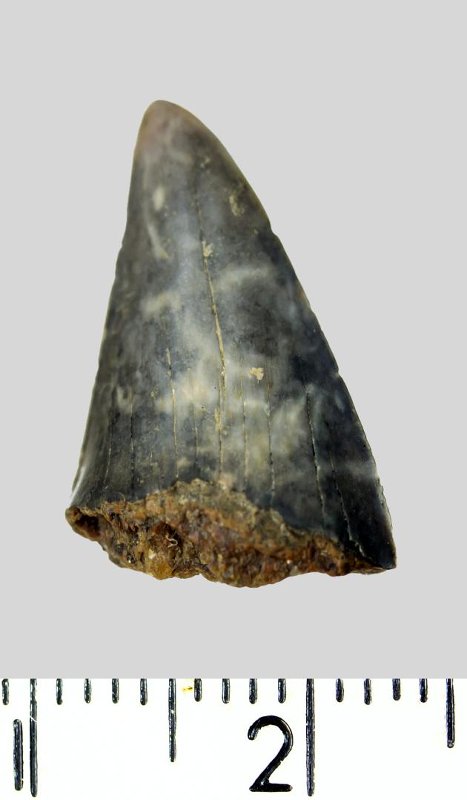 Зуб (фрагмент). Акула. Otodus subserratus (Agassiz, 1843). Классификация: Хордовые Chordata, Позвоночные Vertebrata, Хрящевые рыбы Chondrichthyes, Пластиножаберные Elasmobranchii