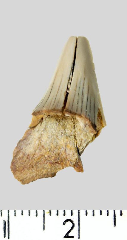 Зуб (фрагмент). Акула. Otodus subserratus (Agassiz, 1843). Классификация: Хордовые Chordata, Позвоночные Vertebrata, Хрящевые рыбы Chondrichthyes, Пластиножаберные Elasmobranchii