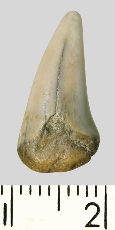 Зуб (фрагмент). Акула. Lamniformes gen. et sp. indet. Классификация: Хордовые Chordata, Позвоночные Vertebrata, Хрящевые рыбы Chondrichthyes, Пластиножаберные Elasmobranchii