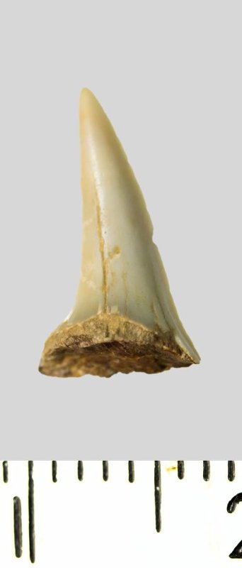 Зуб (фрагмент). Акула. Hypotodus sp. Классификация: Хордовые Chordata, Позвоночные Vertebrata, Хрящевые рыбы Chondrichthyes, Пластиножаберные Elasmobranchii