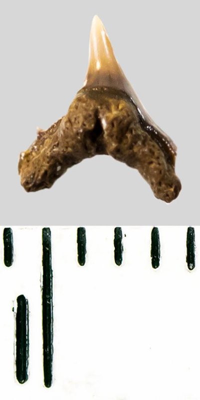 Мелкий боковой зуб с коронкой серо-кремового цвета, колющего типа, S-образно изогнутой, без скульптуры, с гладким режущим краем. Корень бурый, арочный, с высокими и тонкими ветвями, со следами окатанности, весь смещен на лингвальную сторону зуба. С лингвальной стороны корня питательная борозда. Добавочные зубцы коронки сколоты.
