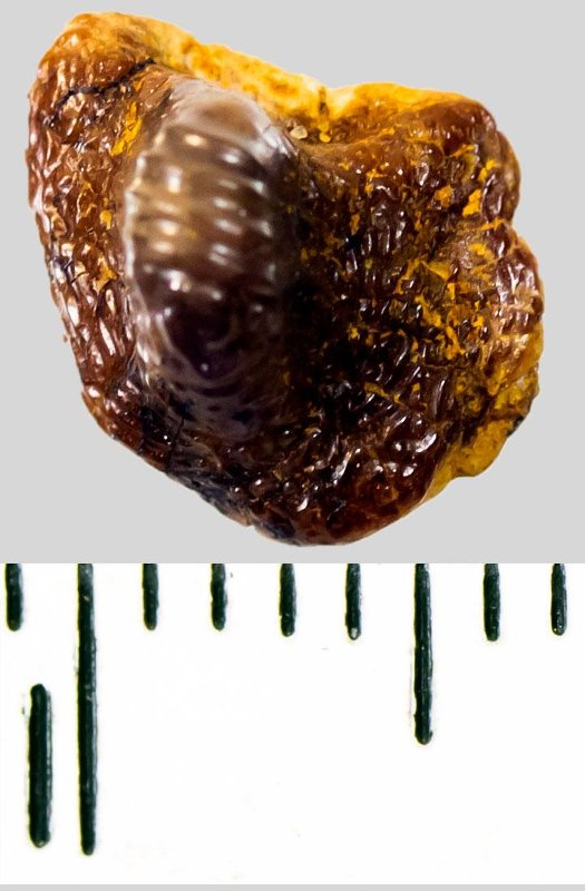 Небольшой массивный зуб с коронкой темно-охристого цвета, дробящего типа без обособленных вершин, нависающей над корнем и покрытой частыми, поперечными ребрами. Краевая поверхность покрыта мелкими гранулами. Центральная часть коронки образует сильно выпуклый, сосцевидный валик. Корень охристый, толстый, ромбовидный, с питательными отверстиями по периметру основания коронки.