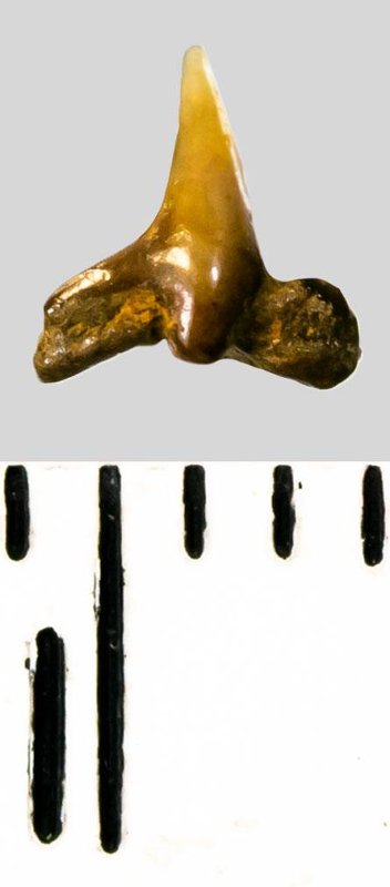 Мелкий боковой (?) зуб с коронкой охристого цвета, колющего типа. Главная вершина округлая в сечении, с гладким режущим краем, от нее справа и слева вдоль корня отходят два киля, не образующие добавочных зубцов. Эмаль коронки не скульптирована. Корень уплощенный, ромбовидный, расположен под острым углом к коронке, темно-охристого цвета, с питательным отверстием с вентральной стороны, заметно окатанный.