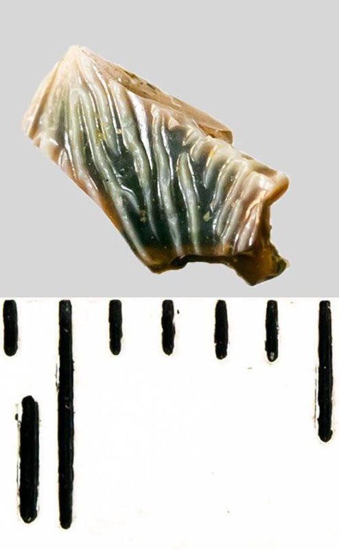 Небольшой фрагмент низкой, уплощенной коронки серо-охристого цвета, дробящего типа, со смятой в грубые складки эмалью.