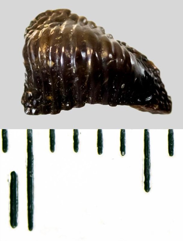 Сильно поврежденный сколами фрагмент массивной коронки бурого цвета, дробящего типа без обособленных вершин, покрытой частыми, поперечными ребрами. Центральная часть коронки образует сильно выпуклое, сосцевидное вздутие. Корень не сохранился.
