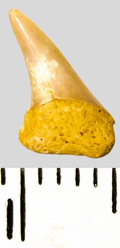 Коронка мелкого бокового зуба бежевого цвета, режущего типа, S-образно изогнутая, с гладким режущим краем. Корень охристый, сильно окатанный, сохранился фрагментарно.
