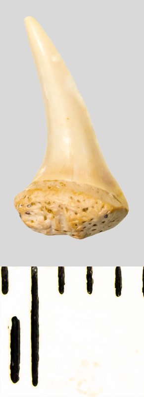 Коронка мелкого бокового зуба светло-кремового цвета, режущего типа, S-образно изогнутая, с гладким режущим краем. Корень кремового цвета, сильно окатанный, сохранился фрагментарно.