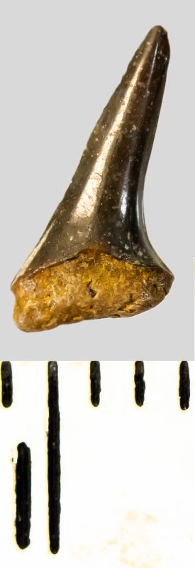 Коронка мелкого бокового зуба бурого цвета, режущего типа, S-образно изогнутая, с гладким режущим краем. Корень темно-охристый, сильно окатанный, сохранился фрагментарно.