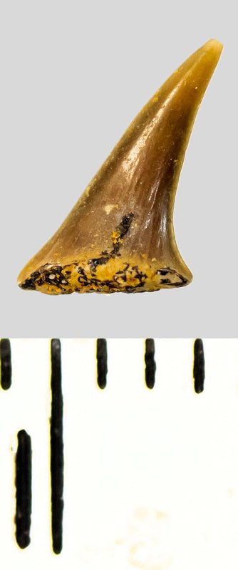Зуб (фрагмент). Акула. Eostriatolamia subulata (Agassiz, 1843). Классификация: Хордовые Chordata, Позвоночные Vertebrata, Хрящевые рыбы Chondrichthyes, Пластиножаберные Elasmobranchii, Акулы Selachii, Ламнообразные Lamniformes, Песчаные акулы Odontaspididae
