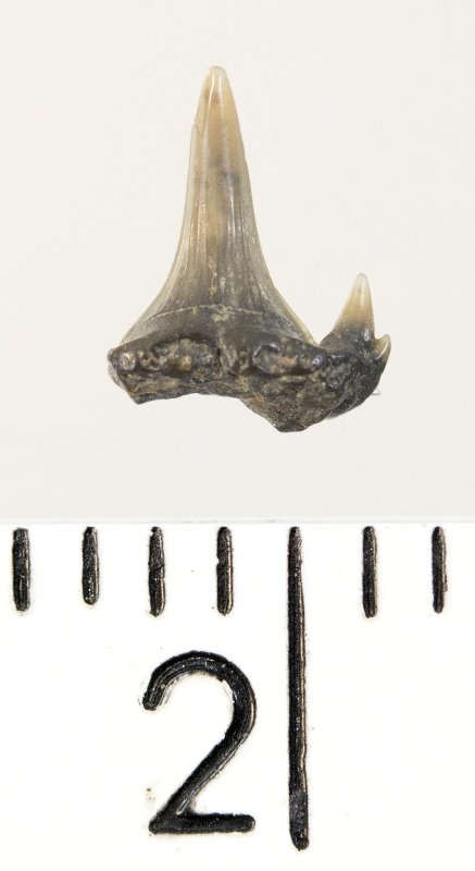 Мелкий боковой зуб с коронкой темно-серого цвета, колюще-режущего типа, S-образно изогнутой, с гладким режущим краем. С лингвальной стороны у основания коронки на эмали имеется скульптура в виде слабой продольной струйчатости. Корень черный, арочный, умеренно массивный, со следами окатанности, левая ветвь утрачена. Имеется одна питательная борозда с лингвальной стороны корня. Имелась одна пара добавочных зубцов коронки, сохранился только правый.