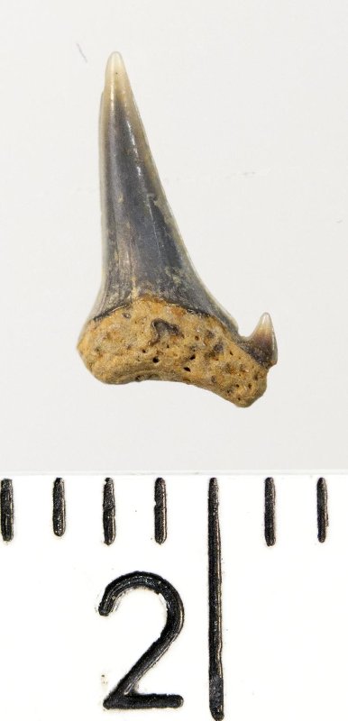 Мелкий боковой зуб с коронкой темно-серого цвета, режущего типа, S-образно изогнутой, с гладким режущим краем. С лингвальной стороны у основания коронки на эмали имеется скульптура в виде слабой продольной струйчатости. Корень темно-охристый, арочный, умеренно массивный, со следами сильной окатанности, левая ветвь утрачена. Имелась одна пара добавочных зубцов коронки, сохранился только правый.