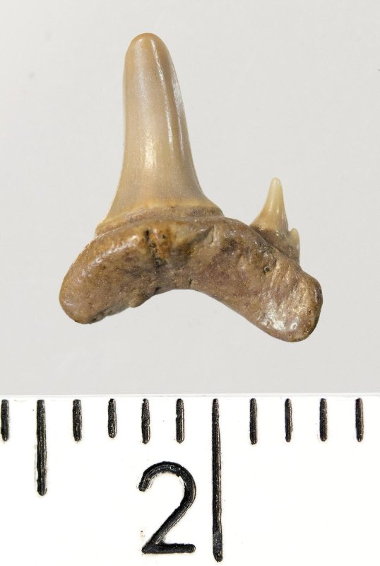 Мелкий боковой зуб с коронкой серо-охристого цвета, колюще-режущего типа, S-образно изогнутой, с гладким режущим краем. Корень охристый, арочный, умеренно массивный, со следами окатанности, левая ветвь утрачена. Имеется одна питательная борозда с лингвальной стороны корня. Имелись две пары добавочных зубцов коронки, сохранилась только правая.