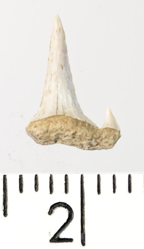 Мелкий боковой зуб с коронкой светло-серого цвета, колюще-режущего типа, S-образно изогнутой, с гладким режущим краем. Корень серо-охристый, арочный, умеренно массивный, со следами окатанности и эрозии, левая ветвь утрачена. Имелась одна пара добавочных зубцов коронки, сохранился только правый.