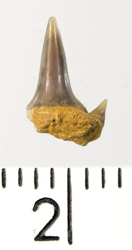 Зуб. Акула. Eostriatolamia subulata (Agassiz, 1843). Классификация: Хордовые Chordata, Позвоночные Vertebrata, Хрящевые рыбы Chondrichthyes, Пластиножаберные Elasmobranchii, Акулы Selachii, Ламнообразные Lamniformes, Песчаные акулы Odontaspididae