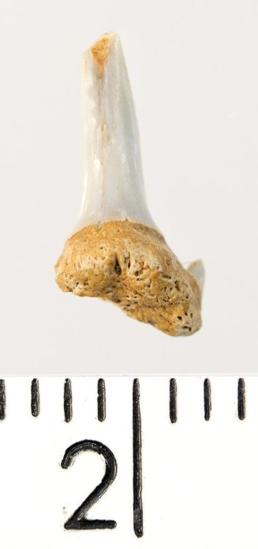 Мелкий боковой зуб с коронкой светло-серого цвета, колюще-режущего типа, S-образно изогнутой, с гладким режущим краем. Корень охристый, арочный, умеренно массивный, со следами окатанности, левая ветвь утрачена. Имеется одна питательная борозда с лингвальной стороны корня. Имелась одна пара добавочных зубцов коронки, сохранился только правый.