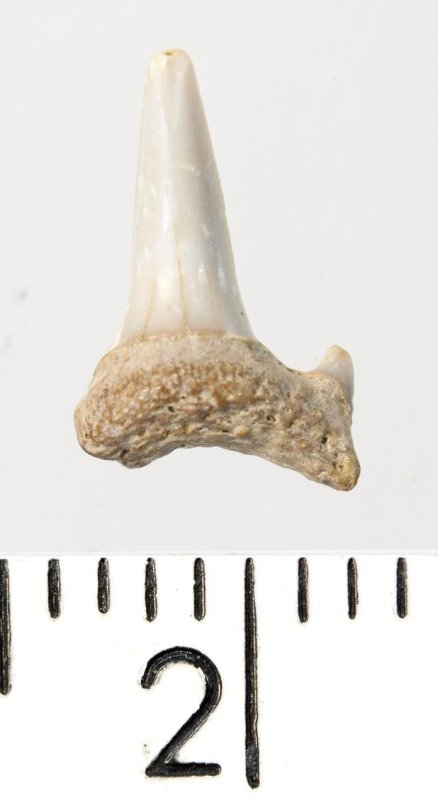 Мелкий боковой зуб с коронкой светло-серого цвета, колюще-режущего типа, S-образно изогнутой, с гладким режущим краем. Корень грязно-кремового цвета, арочный, умеренно массивный, со следами окатанности, левая ветвь утрачена. Имелась одна пара добавочных зубцов коронки, сохранился только правый.