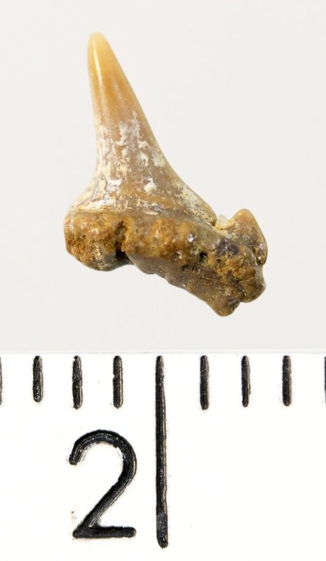 Мелкий боковой зуб с коронкой охристого цвета, режущего типа, S-образно изогнутой, с гладким режущим краем. Корень охристый, арочный, умеренно массивный, со следами окатанности, левая ветвь утрачена. Имеется одна питательная борозда с лингвальной стороны корня. Имелась одна пара добавочных зубцов коронки, сохранился только правый.