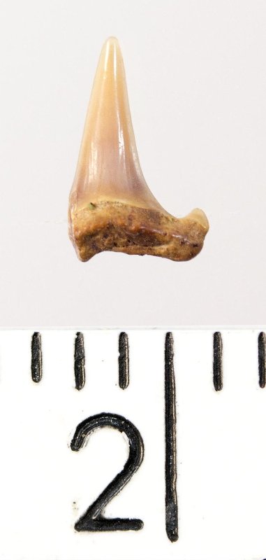 Мелкий боковой зуб с коронкой кремового цвета, колюще-режущего типа, S-образно изогнутой, с гладким режущим краем. Корень охристый, арочный, умеренно массивный, со следами окатанности, левая ветвь утрачена. Имелась одна пара добавочных зубцов коронки, сохранился только правый.