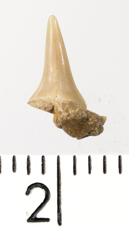 Зуб. Акула. Eostriatolamia subulata (Agassiz, 1843). Классификация: Хордовые Chordata, Позвоночные Vertebrata, Хрящевые рыбы Chondrichthyes, Пластиножаберные Elasmobranchii, Акулы Selachii, Ламнообразные Lamniformes, Песчаные акулы Odontaspididae