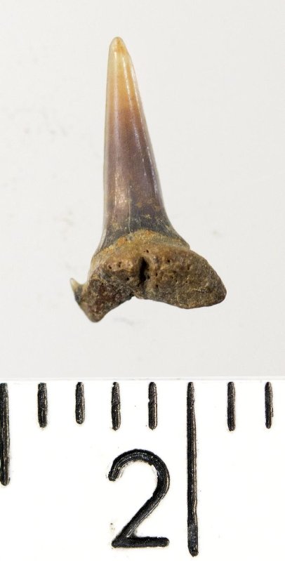 Зуб. Акула. Eostriatolamia subulata (Agassiz, 1843). Классификация: Хордовые Chordata, Позвоночные Vertebrata, Хрящевые рыбы Chondrichthyes, Пластиножаберные Elasmobranchii, Акулы Selachii, Ламнообразные Lamniformes, Песчаные акулы Odontaspididae