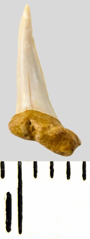 Мелкий боковой зуб с коронкой молочного цвета, режущего типа, S-образно изогнутой, с гладким режущим краем. Корень темно-кремового цвета, арочный, умеренно массивный, со следами окатанности, левая ветвь утрачена. Имеется одна питательная борозда с лингвальной стороны корня. Добавочные зубцы коронки отсутствуют.