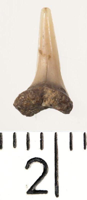 Мелкий боковой зуб с коронкой рыжевато-бежевого цвета, колюще-режущего типа, S-образно изогнутой, с гладким режущим краем. С лингвальной стороны у основания коронки на эмали имеется скульптура в виде слабой продольной струйчатости. Корень бурый, арочный, умеренно массивный, со следами окатанности. Имеется одна питательная борозда с лингвальной стороны корня. Добавочные зубцы коронки зуба отсутствуют.
