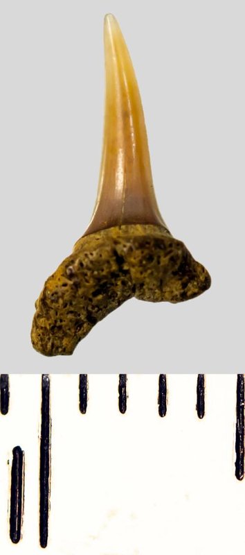 Мелкий боковой зуб с коронкой охристого цвета, колюще-режущего типа, S-образно изогнутой, с гладким режущим краем. С лингвальной стороны у основания коронки на эмали имеется скульптура в виде слабой продольной струйчатости. Корень бурый, арочный, умеренно массивный, со следами окатанности, правая ветвь утрачена. Имеется одна питательная борозда с лингвальной стороны корня. Добавочные зубцы коронки зуба отсутствуют.