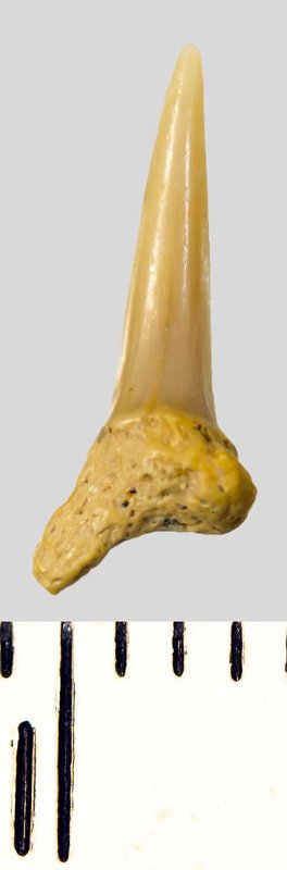 Зуб. Акула. Eostriatolamia subulata (Agassiz, 1843). Классификация: Хордовые Chordata, Позвоночные Vertebrata, Хрящевые рыбы Chondrichthyes, Пластиножаберные Elasmobranchii, Акулы Selachii, Ламнообразные Lamniformes, Песчаные акулы Odontaspididae