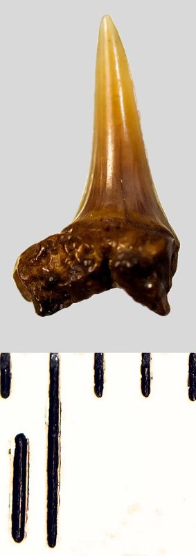 Мелкий боковой зуб с коронкой охристого цвета, колюще-режущего типа, S-образно изогнутой, с гладким режущим краем. С лингвальной стороны у основания коронки на эмали имеется скульптура в виде слабой продольной струйчатости. Корень бурый, арочный, умеренно массивный, со следами окатанности, правая ветвь утрачена. Имеется одна питательная борозда с лингвальной стороны корня. Добавочные зубцы коронки зуба отсутствуют.