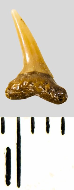 Мелкий боковой зуб с коронкой охристого цвета, режущего типа, S-образно изогнутой, с гладким режущим краем. Корень темно-охристый, арочный, умеренно массивный, со следами окатанности. Добавочные зубцы коронки зуба отсутствуют.