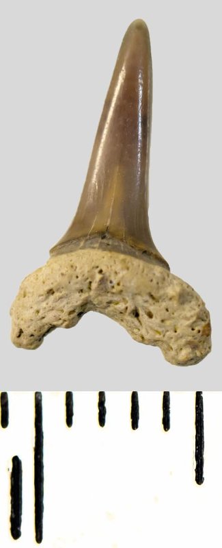 Зуб. Акула. Eostriatolamia subulata (Agassiz, 1843). Классификация: Хордовые Chordata, Позвоночные Vertebrata, Хрящевые рыбы Chondrichthyes, Пластиножаберные Elasmobranchii, Акулы Selachii, Ламнообразные Lamniformes, Песчаные акулы Odontaspididae