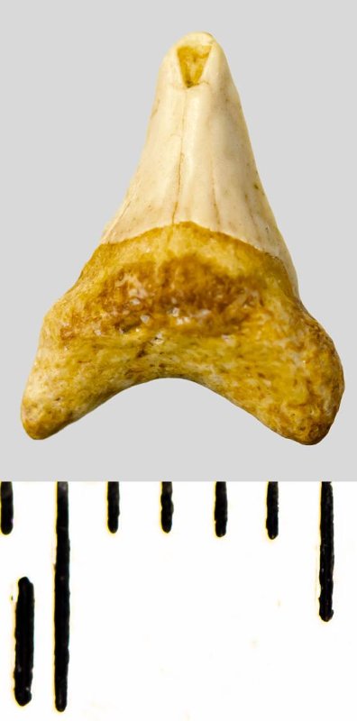 Мелкий боковой зуб с коронкой светло-кремового цвета, режущего типа, S-образно изогнутой, с гладким режущим краем. Корень светло-охристый, арочный, умеренно массивный, со следами окатанности. Добавочные зубцы коронки зуба отсутствуют.