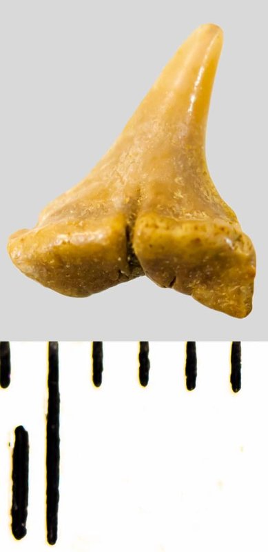 Мелкий боковой зуб с коронкой охристого цвета, режущего типа, S-образно изогнутой, с гладким режущим краем. Корень охристый, арочный, умеренно массивный, со следами окатанности. Имеется одна питательная борозда с лингвальной стороны корня. Добавочные зубцы коронки зуба отсутствуют.