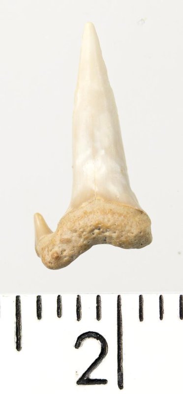 Зуб. Акула. Eostriatolamia subulata (Agassiz, 1843). Классификация: Хордовые Chordata, Позвоночные Vertebrata, Хрящевые рыбы Chondrichthyes, Пластиножаберные Elasmobranchii, Акулы Selachii, Ламнообразные Lamniformes, Песчаные акулы Odontaspididae