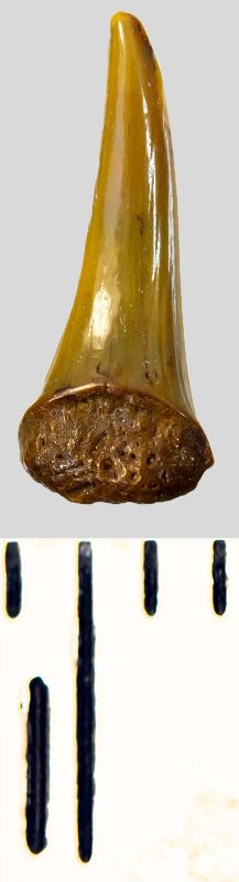 Коронка мелкого бокового зуба серовато-охристого цвета, колюще-режущего типа, S-образно изогнутой, с гладким режущим краем. С лингвальной стороны у основания коронки на эмали имеется скульптура в виде слабой продольной струйчатости. Корень темно-охристый, сильно окатанный, сохранился фрагментарно.