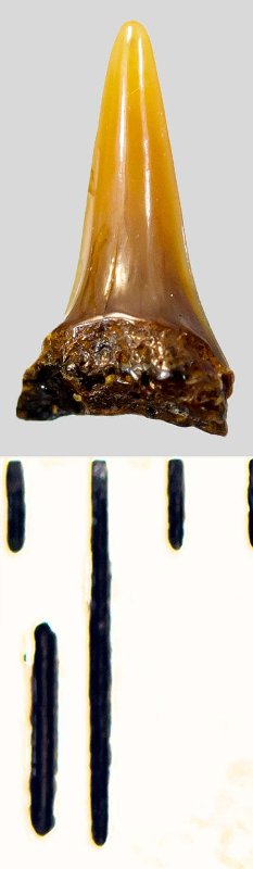 Зуб (фрагмент). Акула. Eostriatolamia subulata (Agassiz, 1843). Классификация: Хордовые Chordata, Позвоночные Vertebrata, Хрящевые рыбы Chondrichthyes, Пластиножаберные Elasmobranchii, Акулы Selachii, Ламнообразные Lamniformes, Песчаные акулы Odontaspididae