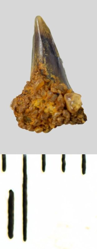 Коронка мелкого бокового зуба серого цвета, колюще-режущего типа, S-образно изогнутая, с гладким режущим краем. С лингвальной стороны у основания коронки на эмали имеется скульптура в виде слабой продольной струйчатости. Корень охристый, сохранился фрагментарно