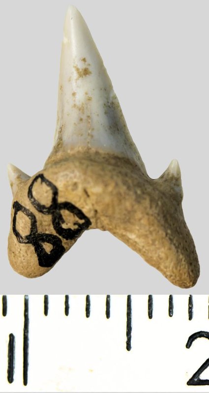 Зуб. Акула. Archaeolamna cf. kopingensis (Davis, 1890). Классификация: Хордовые Chordata, Позвоночные Vertebrata, Хрящевые рыбы Chondrichthyes, Пластиножаберные Elasmobranchii, Акулы Selachii, Ламнообразные Lamniformes