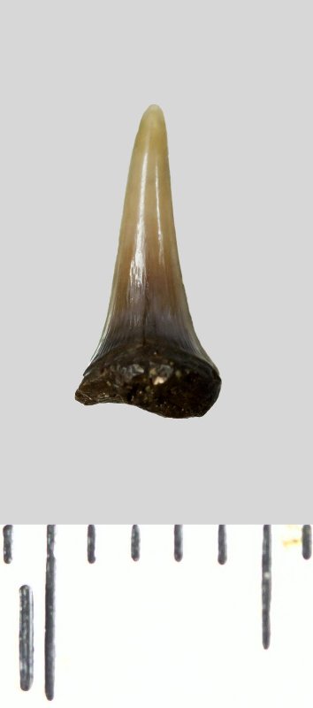Зуб (фрагмент). Акула. Lamniformes gen. et sp. indet. Классификация: Хордовые Chordata, Позвоночные Vertebrata, Хрящевые рыбы Chondrichthyes, Пластиножаберные Elasmobranchii, Акулы Selachii, Ламнообразные Lamniformes