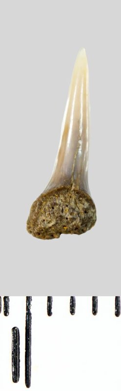 Зуб (фрагмент). Акула. Lamniformes gen. et sp. indet. Классификация: Хордовые Chordata, Позвоночные Vertebrata, Хрящевые рыбы Chondrichthyes, Пластиножаберные Elasmobranchii, Акулы Selachii, Ламнообразные Lamniformes
