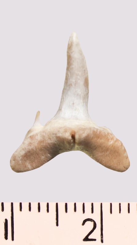 Зуб. Акула. Scapanorhynchus rapax Quaas, 1902. Классификация: Хордовые Chordata, Позвоночные Vertebrata, Хрящевые рыбы Chondrichthyes, Пластиножаберные Elasmobranchii