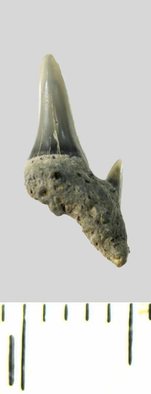 Зуб. Акула. Odontaspis macrorhiza (Cope) Leriche, 1902. Классификация: Хордовые Chordata, Позвоночные Vertebrata, Хрящевые рыбы Chondrichthyes, Пластиножаберные Elasmobranchii, Акулы Selachii, Ламнообразные Lamniformes