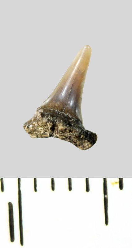 Зуб (фрагмент). Акула. Odontaspis subulata (Agassiz, 1843). Классификация: Хордовые Chordata, Позвоночные Vertebrata, Хрящевые рыбы Chondrichthyes, Пластиножаберные Elasmobranchii, Акулы Selachii, Ламнообразные Lamniformes