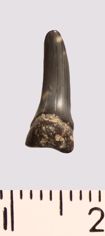 Зуб (фрагмент). Акула. Scapanorhynchus rhaphiodon Agassiz, 1843. Классификация: Хордовые Chordata, Позвоночные Vertebrata, Хрящевые рыбы Chondrichthyes, Пластиножаберные Elasmobranchii