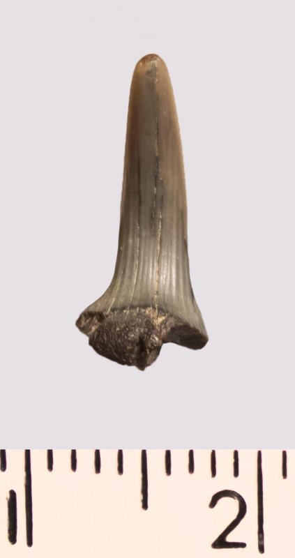 Зуб (фрагмент). Акула. Scapanorhynchus rhaphiodon Agassiz, 1843. Классификация: Хордовые Chordata, Позвоночные Vertebrata, Хрящевые рыбы Chondrichthyes, Пластиножаберные Elasmobranchii