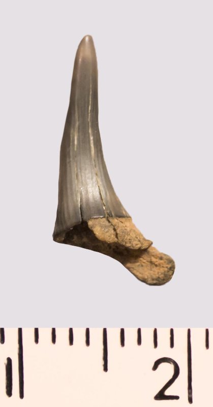 Зуб. Акула. Scapanorhynchus rhaphiodon Agassiz, 1843. Классификация: Хордовые Chordata, Позвоночные Vertebrata, Хрящевые рыбы Chondrichthyes, Пластиножаберные Elasmobranchii