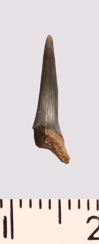 Зуб. Акула. Scapanorhynchus rhaphiodon Agassiz, 1843. Классификация: Хордовые Chordata, Позвоночные Vertebrata, Хрящевые рыбы Chondrichthyes, Пластиножаберные Elasmobranchii