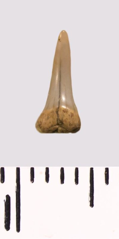 Зуб (фрагмент). Акула. Eostriatolamia sp. Классификация: Хордовые Chordata, Позвоночные Vertebrata, Хрящевые рыбы Chondrichthyes, Пластиножаберные Elasmobranchii